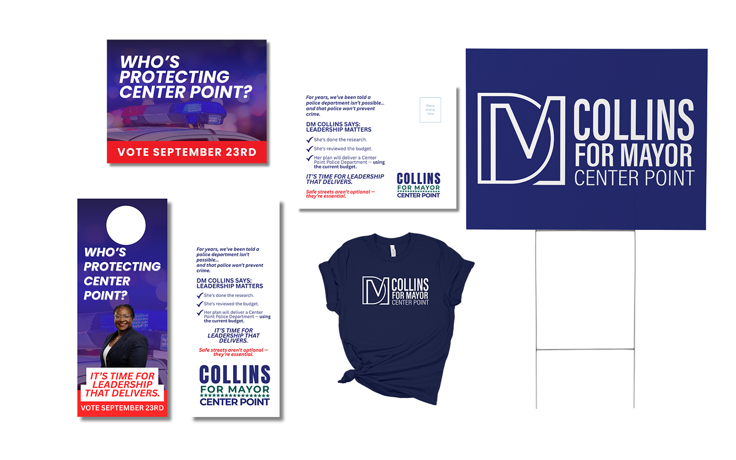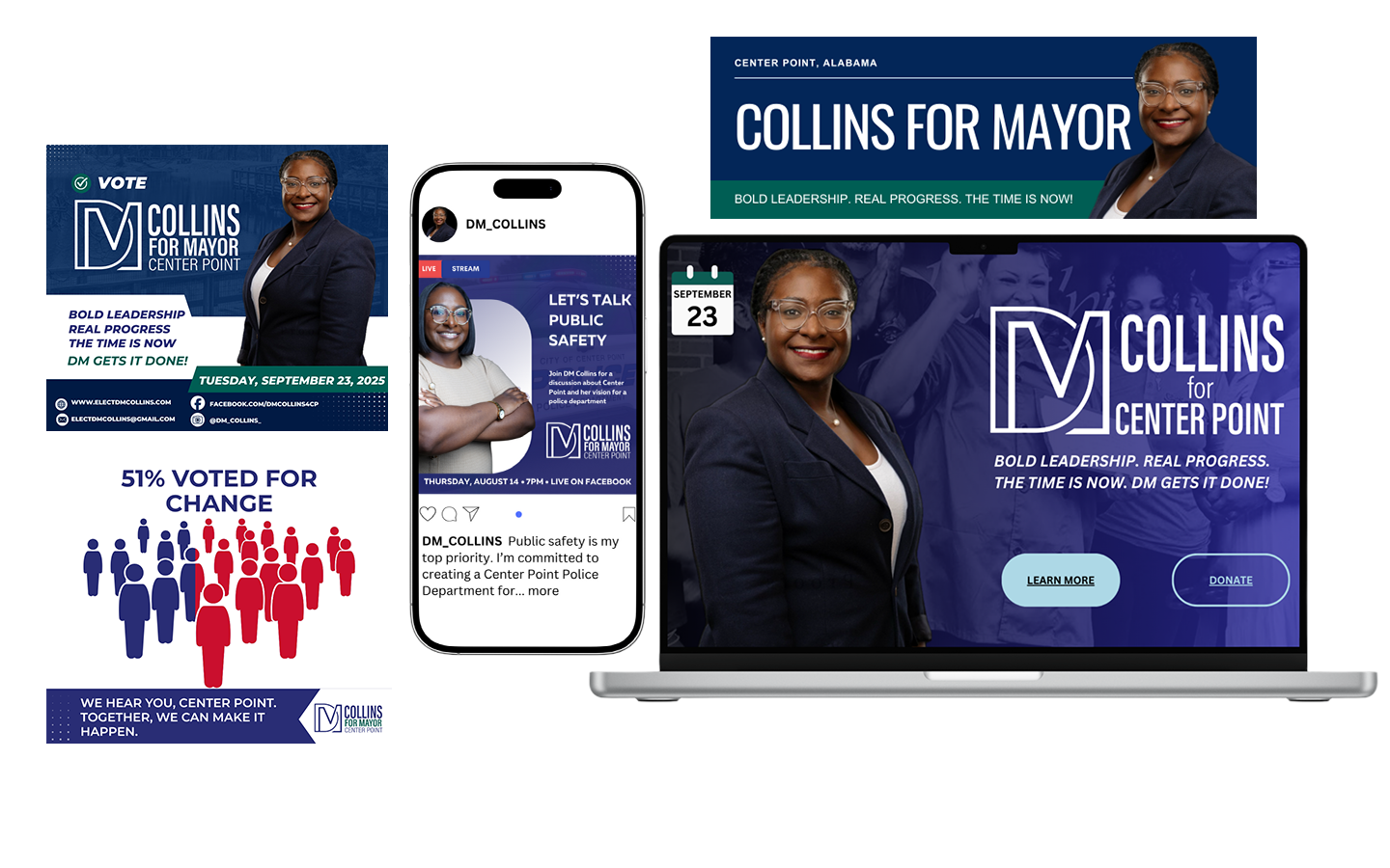 DM Collins launched her mayoral campaign with a vision to bring stronger leadership, community investment, and transparency to the City of Center Point. As Campaign & Communications Manager, I led the full creative and strategic direction for her brand. From shaping her visual identity to managing daily communications, media outreach, and multi-channel campaign marketing.